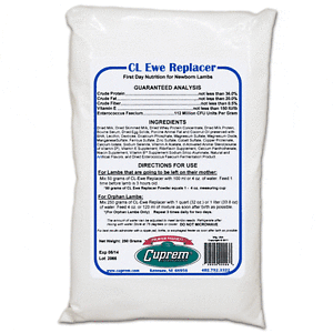 Mix 250 grams of CL-Ewe Replacer with one liter or quart of water and feed 4oz or 120 mL of mixture 3 times a day for up to 2 days. Give the first feeding before the lamb is 3 hours old. Amount of water can be adjusted to meet the lambs needs.