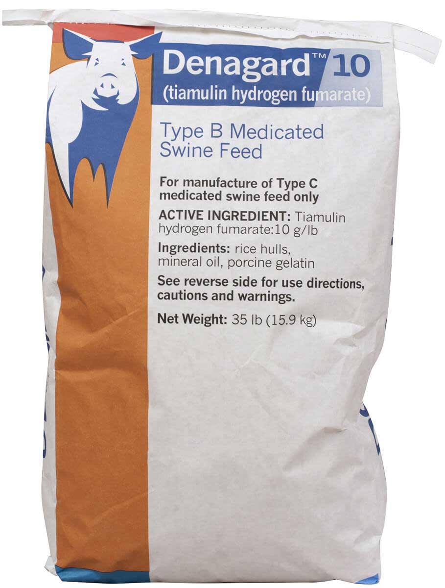 Denagard 10g Premix is a highly effective, broad-spectrum antibiotic used primarily in swine and poultry production. Each 35-pound (15.87 kg) bag contains 10 grams of tiamulin hydrogen fumarate per pound, offering powerful control over respiratory and enteric diseases in livestock. Denagard is particularly effective against swine dysentery, porcine proliferative enteropathy (ileitis), and enzootic pneumonia.