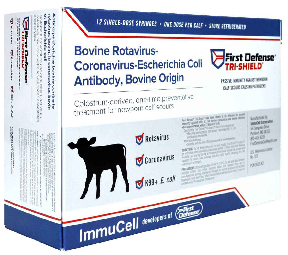 First Defense Tri-Shield is a colostrum-derived boost for newborn calves that aids in the reduction of scours caused by K99 E. coli and bovine coronavirus, while also reducing severity and duration of scours caused by bovine rotavirus. First Defense for calves gives newborn animals specific immunoglobulins at the gut level to deliver immediate protection against disease. Additional antibodies are absorbed into the bloodstream.