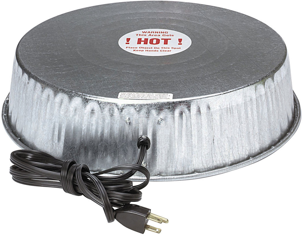 Electric Heater Base helps prevent water from freezing in temperatures as low as 10 degrees F. Designed for use with Little Giant Double Wall Founts (Item Nos. 9832, 9833, 9835, and 9838, sold separately) and other all-metal containers. Perfect for unheated coops and barns; can be used outdoors in a dry, sheltered area. Made of heavy-duty, rust-resistant galvanized steel.
